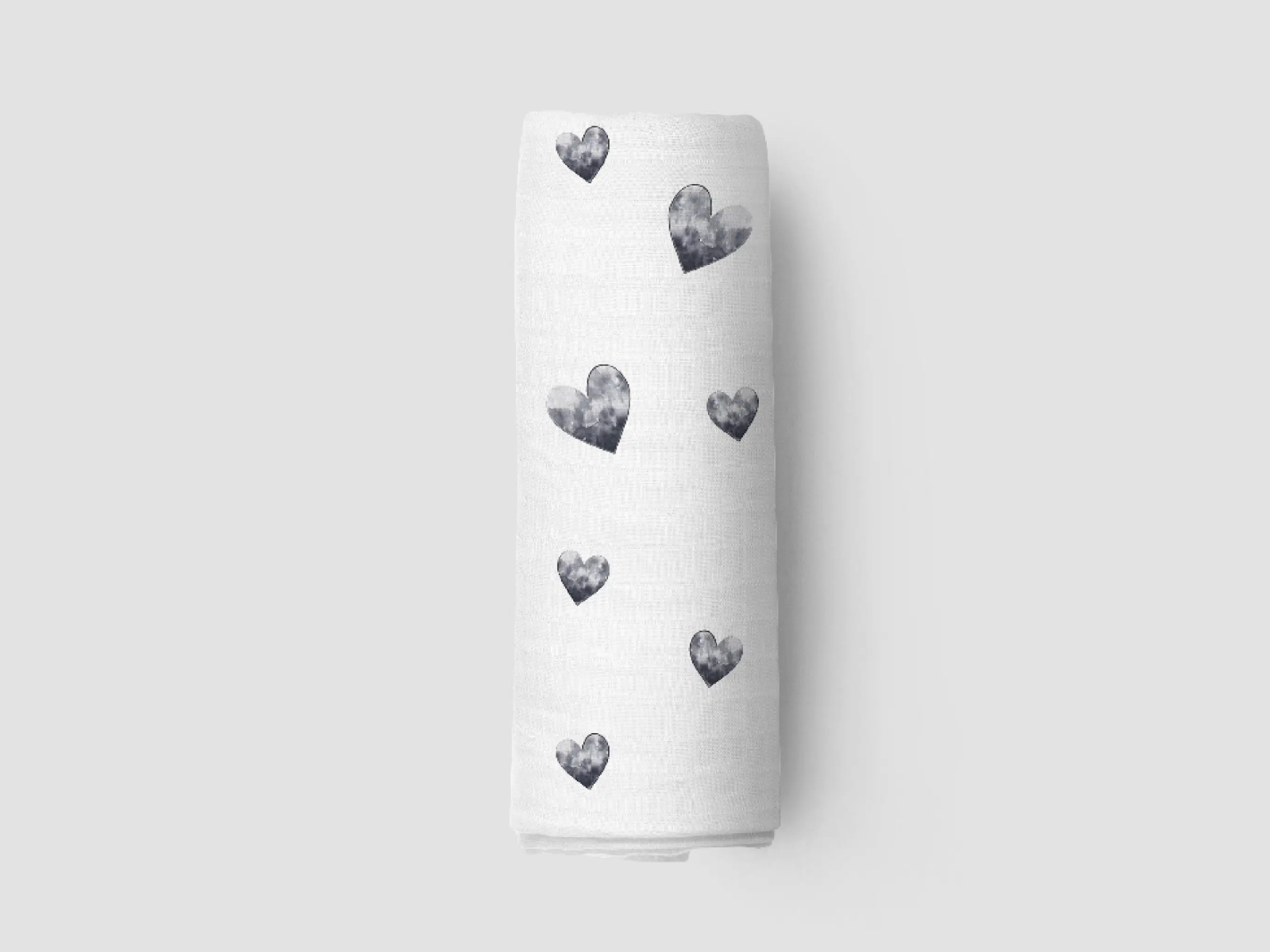 - White muslin blanket available in five (5) patterns: black hearts, black stripes, black galaxy stars, black dots, grey stars
